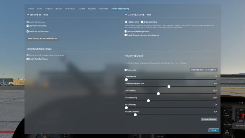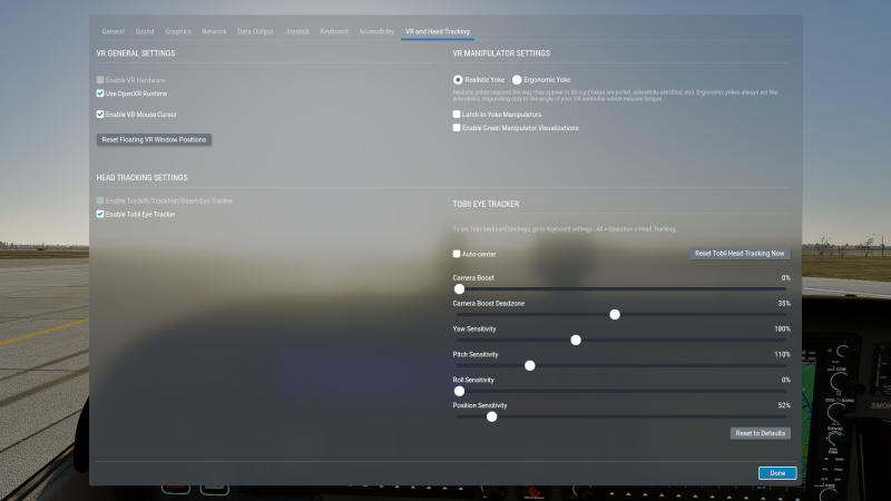 Tobii Eye Tracker 5! funguje v X-Plane 12 naprosto znamenitě a tak máme nyní možnost na výběr čtyři samostatné plně funkční konfigurace létání: 2D zobrazení, VR, VR/Mixed Reality, Tobii Eye Tracker 5.